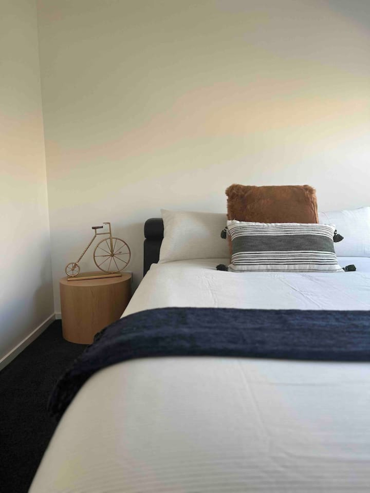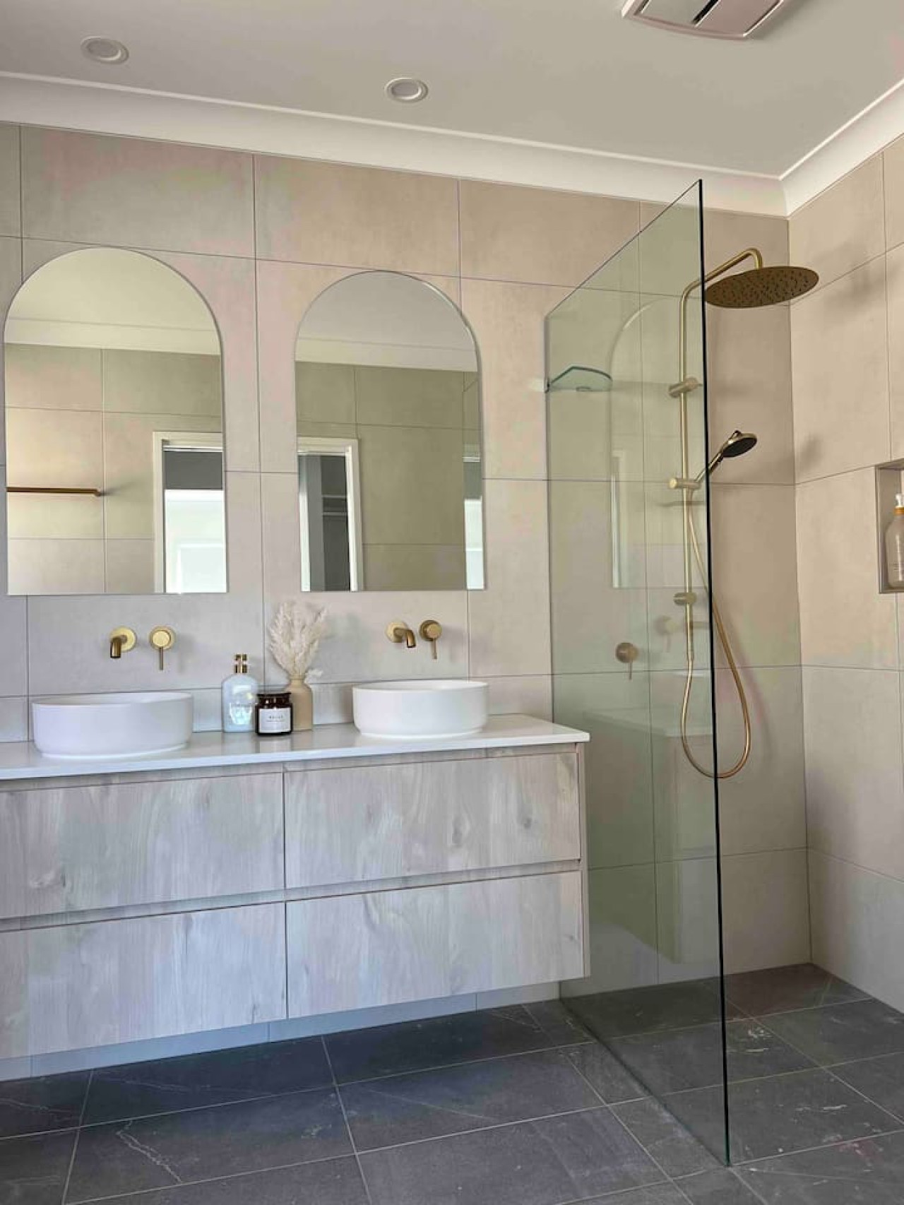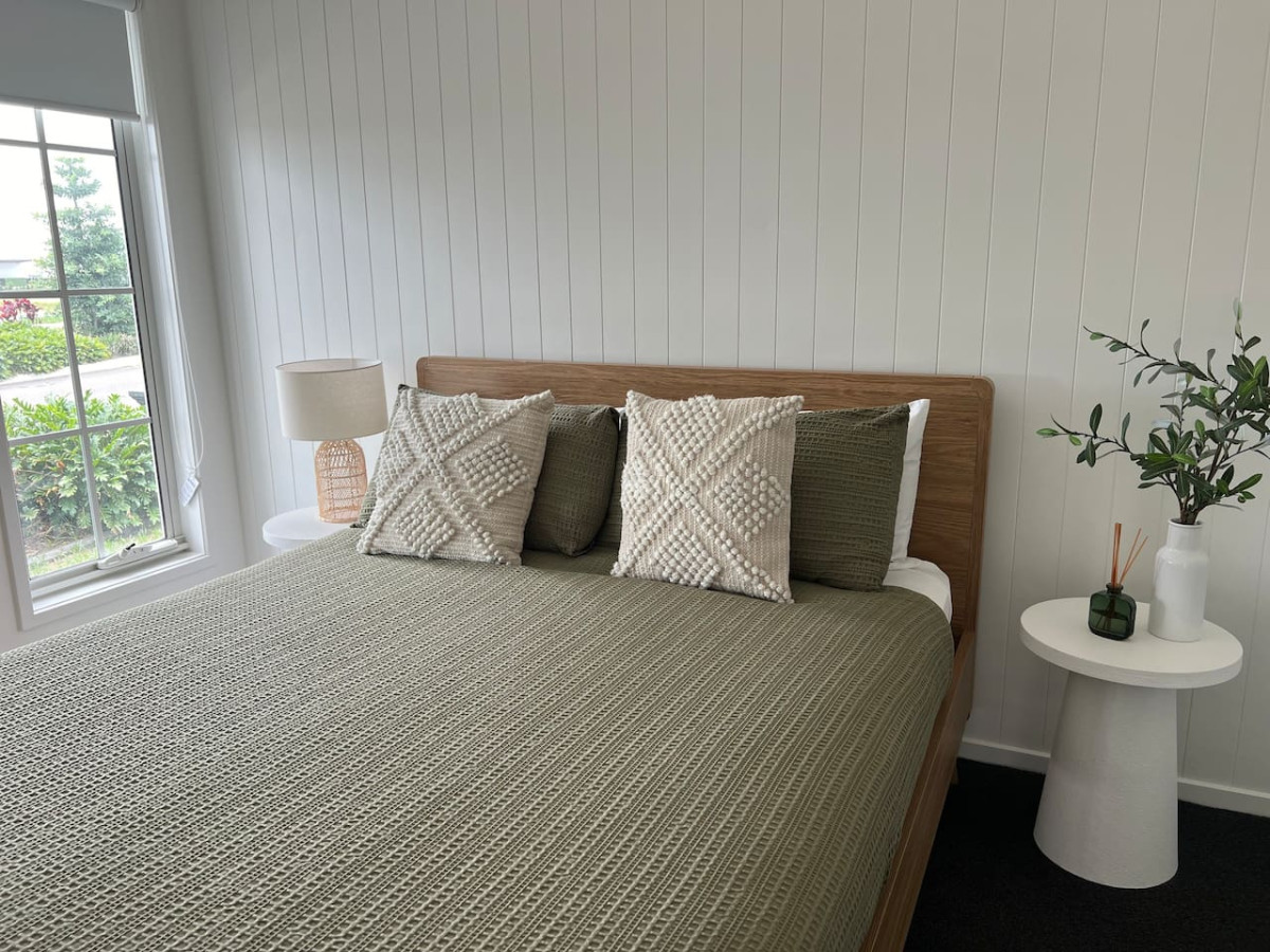 At the front of the home, you will find the main bedroom, which is generously sized with a queen-sized bed and a large walk-in robe that leads you into a luxuriously designed bathroom featuring double basin sinks and a shower big enough for 2.