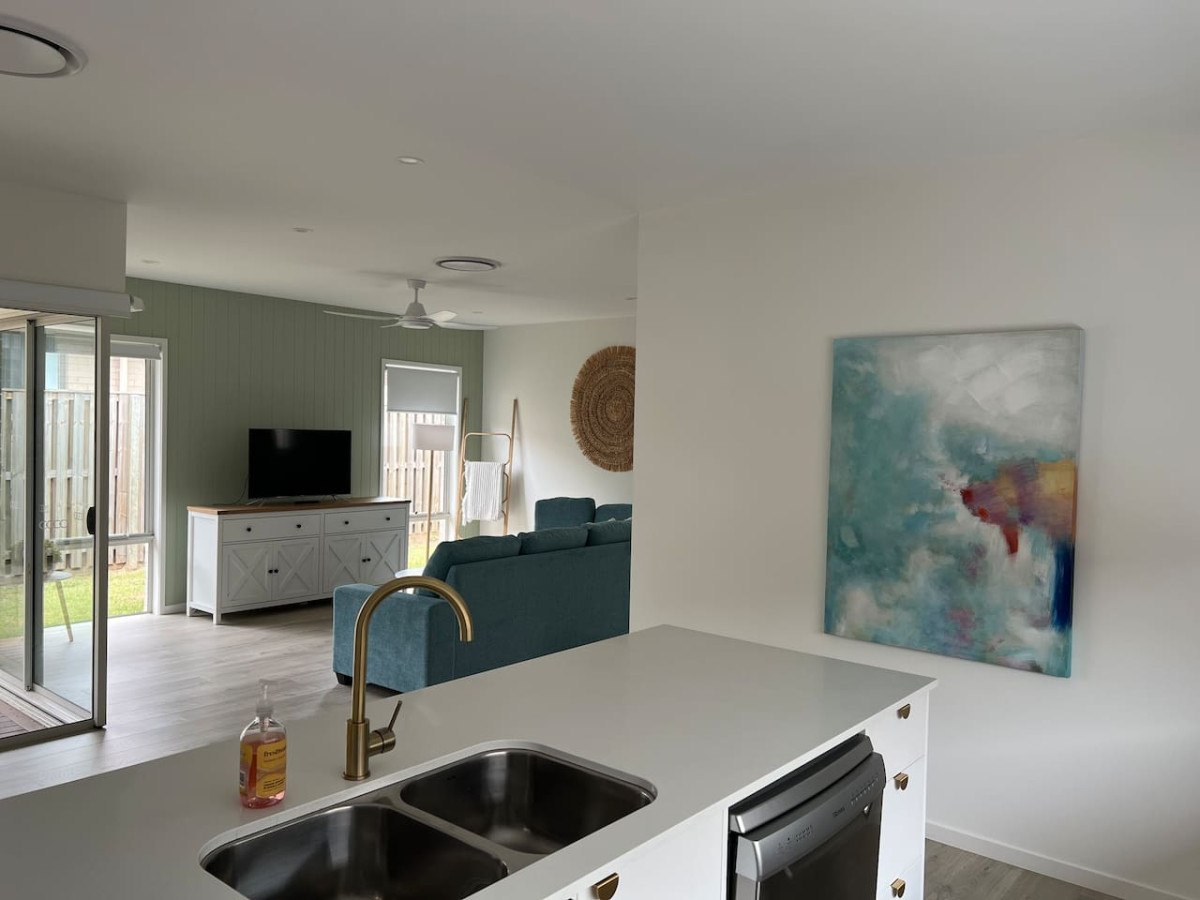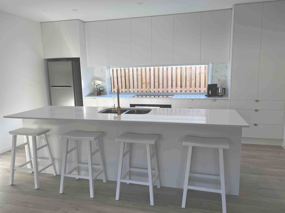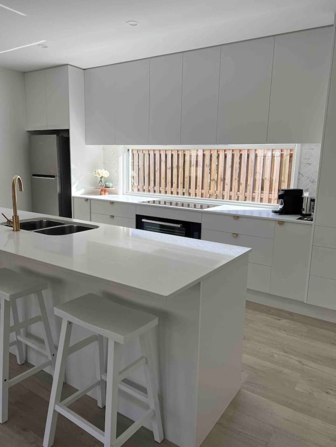The kitchen has a minimalist design with clean lines, sleek surfaces and a large island bench, which serves as a central gathering place for family and guests.