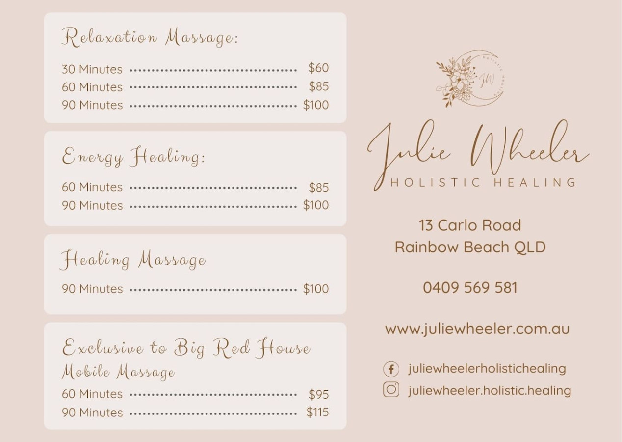 We LOVE offering our guests a memorable and delightful stay, and we have teamed with two local businesses to offer our guests a 10% discount off their meal at Maheno's. Please have a look at their menu in the information booklet. Looking to unwind? We have the amazing Julie, a mobile massage therapist. If you wish to book during your stay, please let us know, and we can provide the details for you to book.