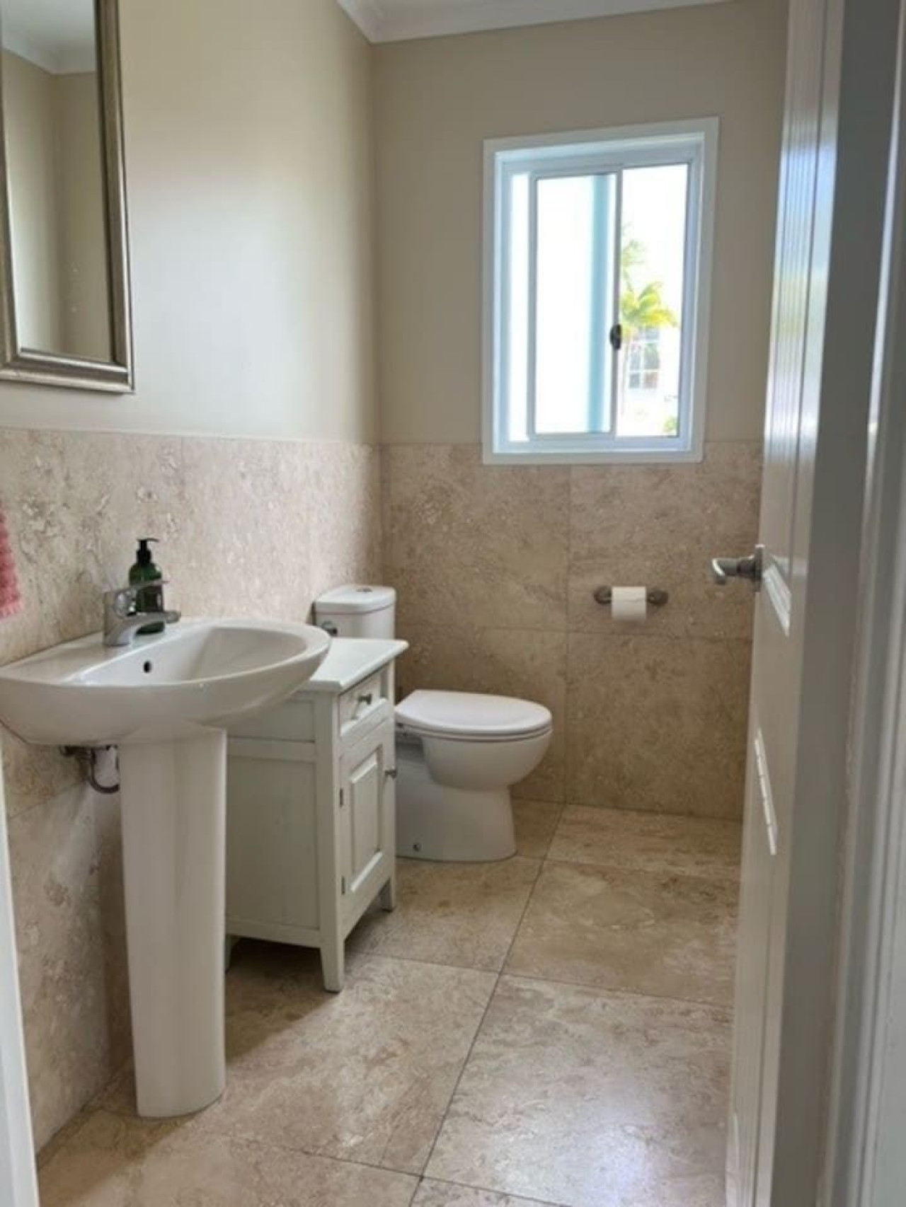 - A large and spacious washroom is located conveniently on the lower level of the home and features a toilet and basin.