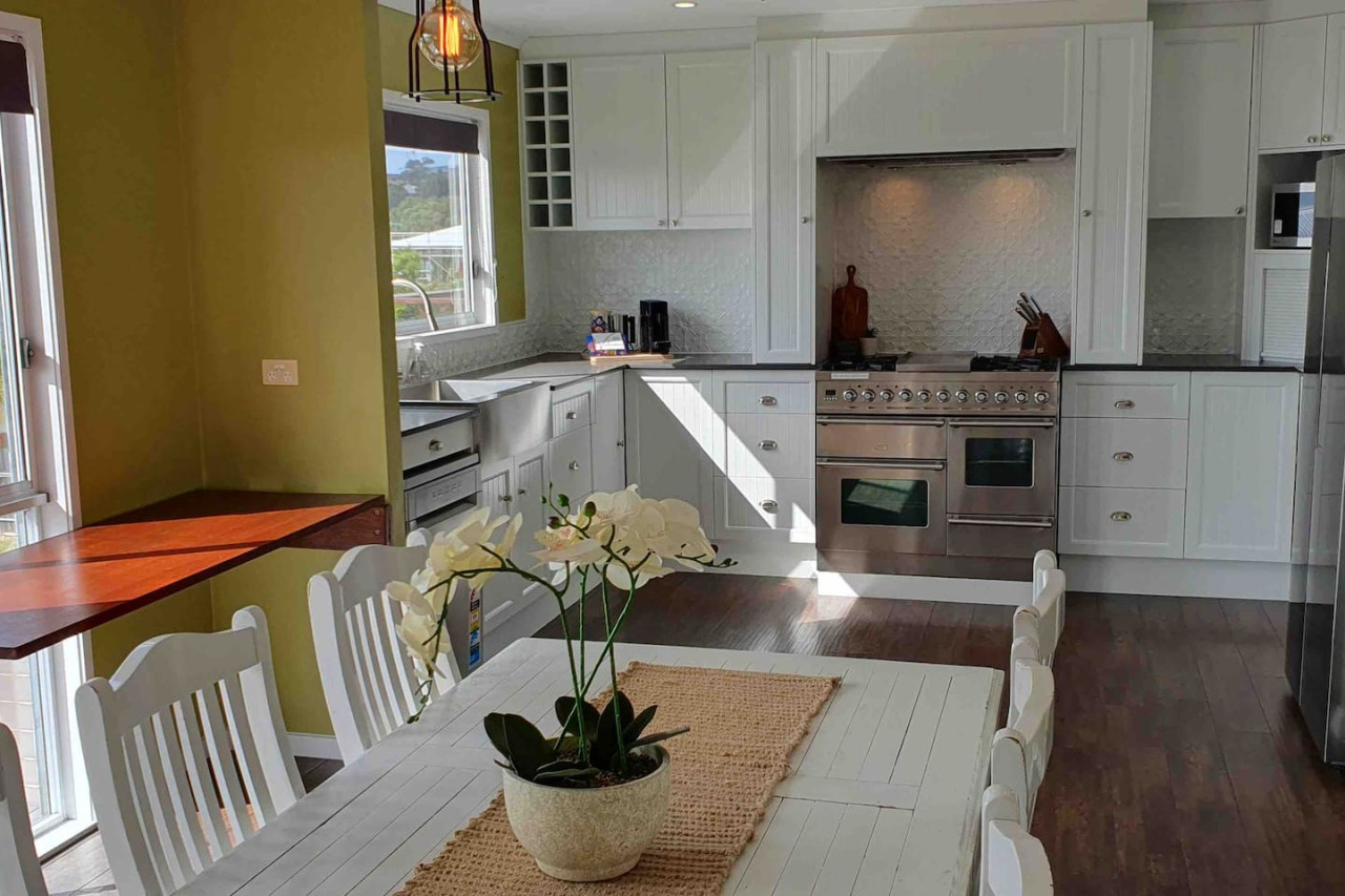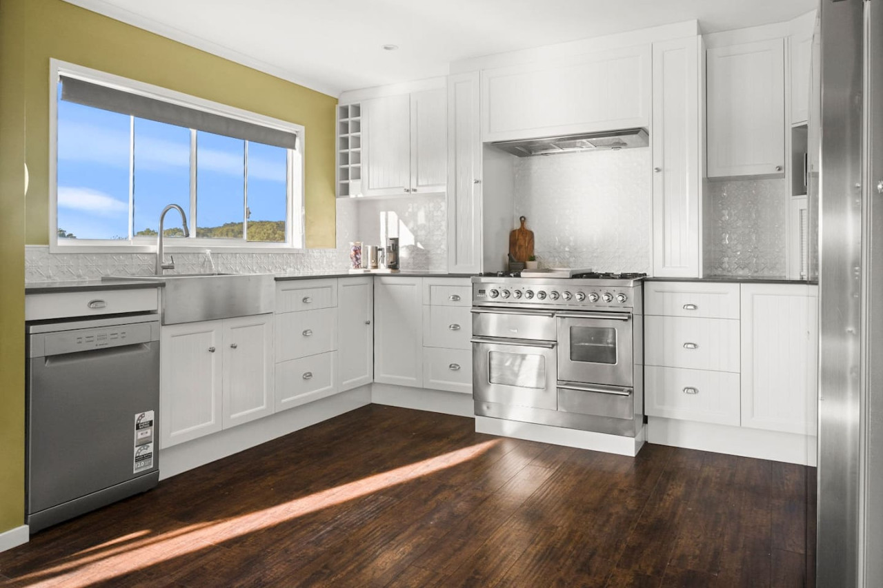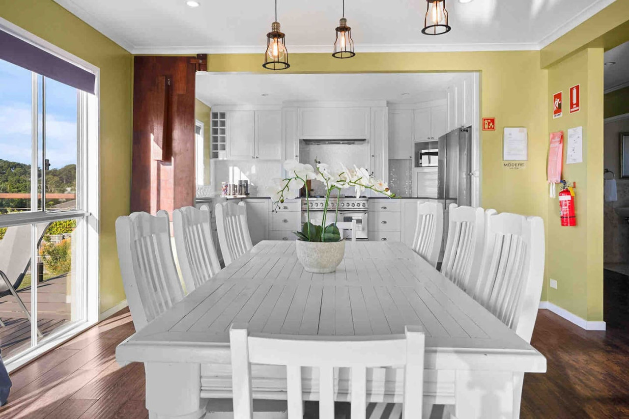 - A fully stocked kitchen equipped with all utensils and a commercial five burner gas cooktop that also features 2 electric ovens, guests can whip up their favourite meals and enjoy them in the large dining area or outside on the deck or with ample seating outdoors.