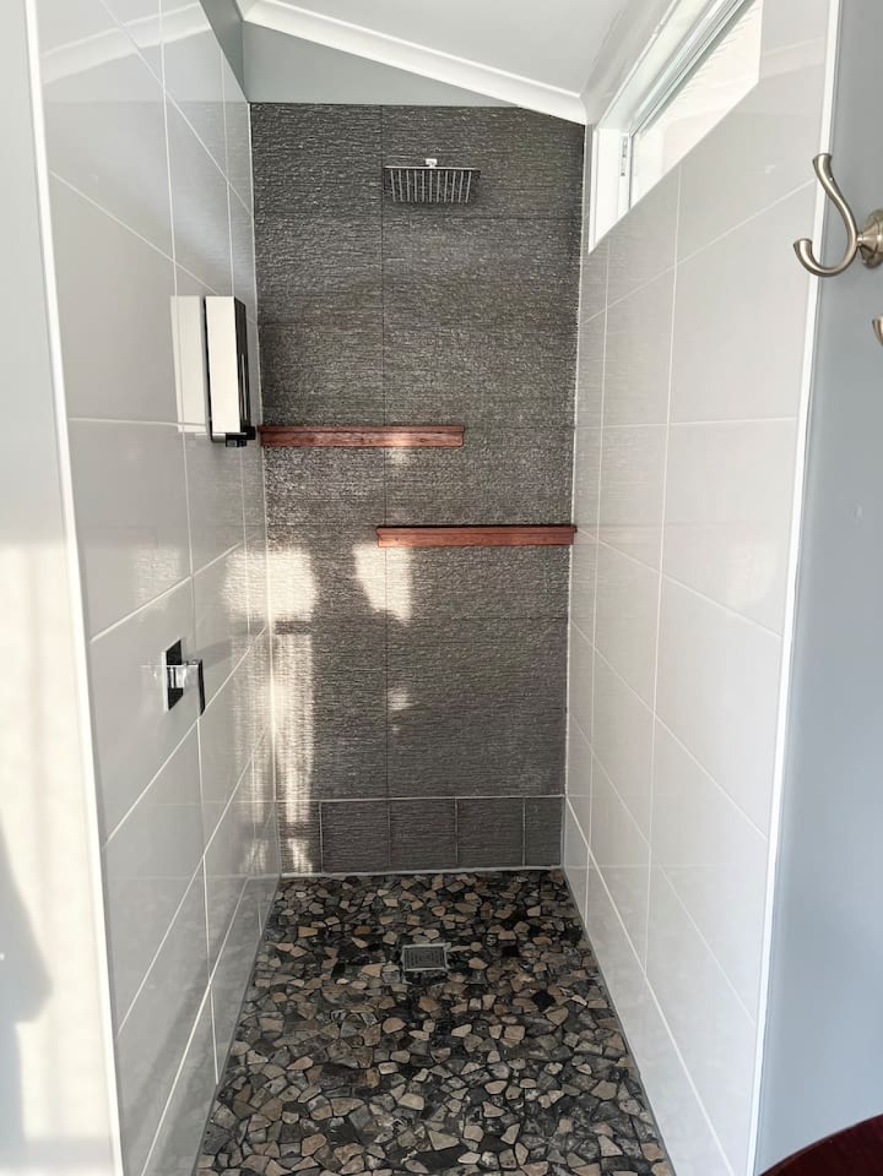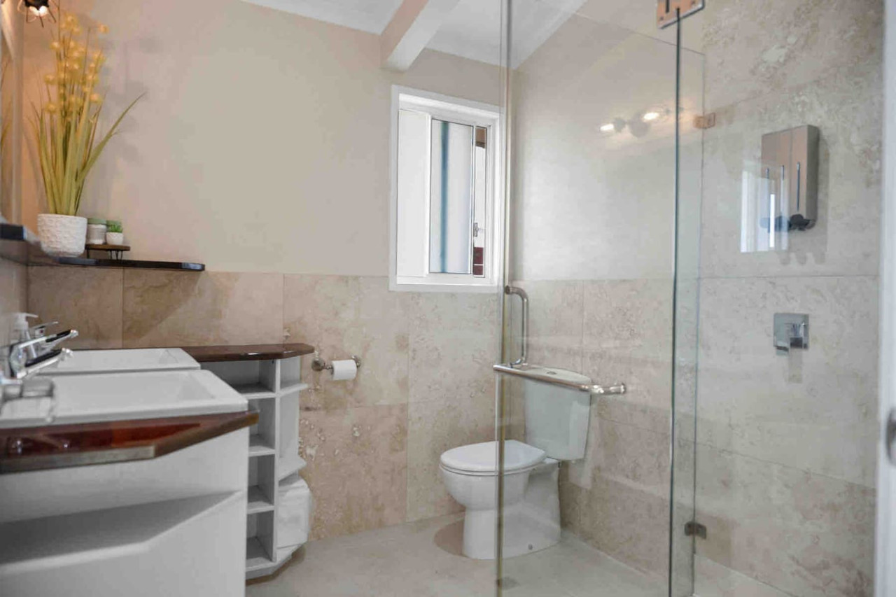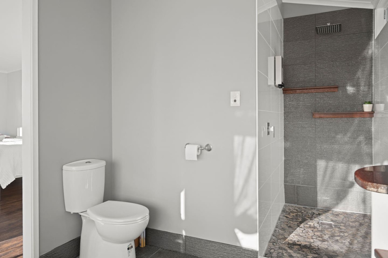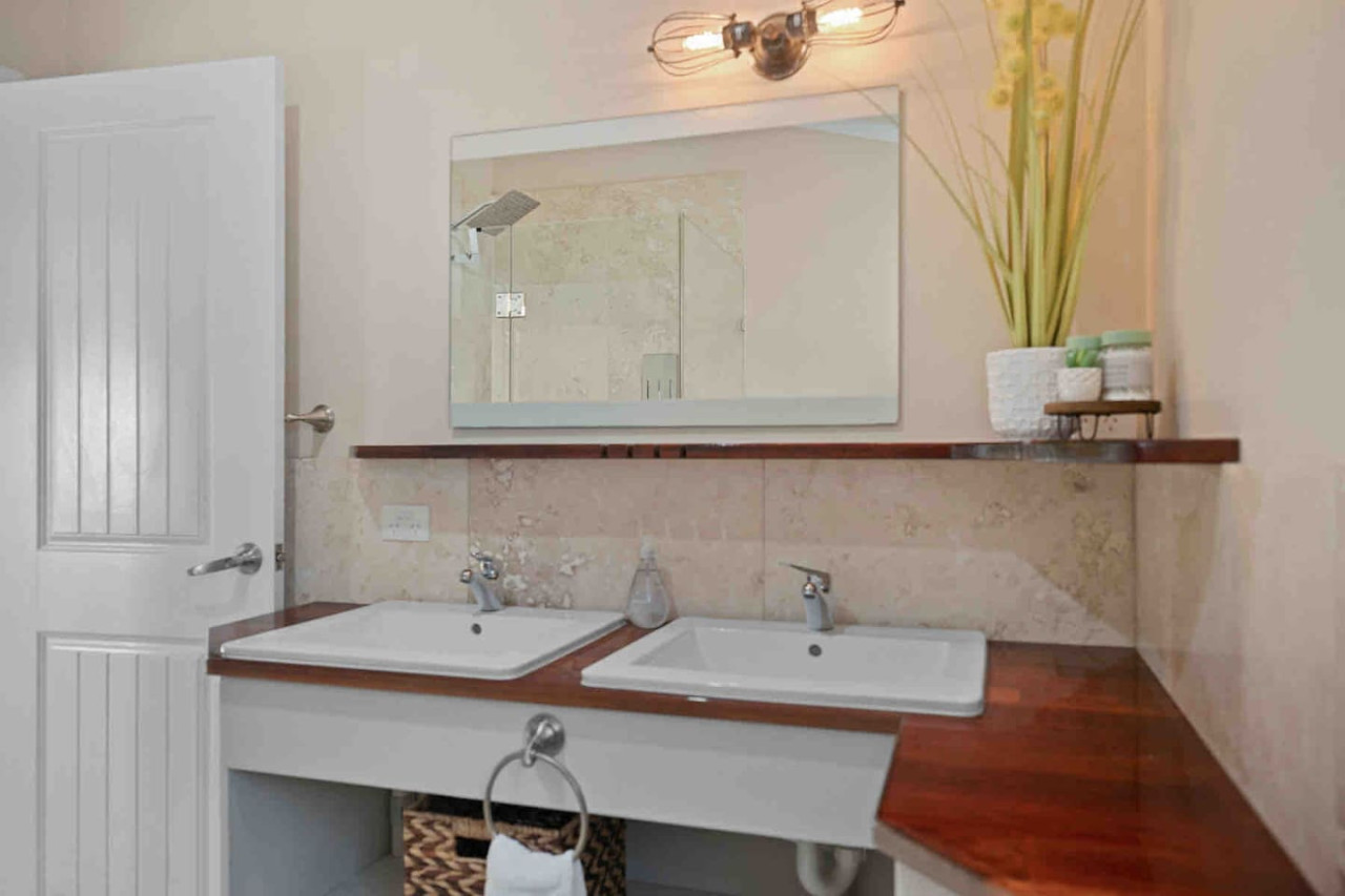 - A shared bathroom that is well stocked with all the essentials; the room features a twin vanity, toilet, and a beautifully large, stoned-floor shower.