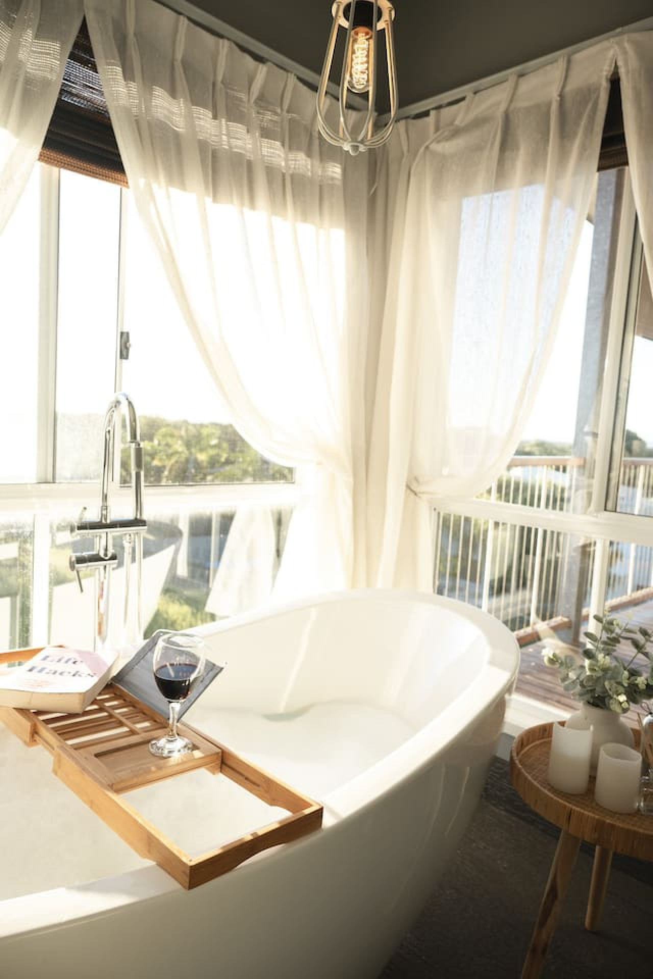 The statement piece of this room is the luxurious bath that is the centrepiece of the bathroom, along with the open stone shower.
