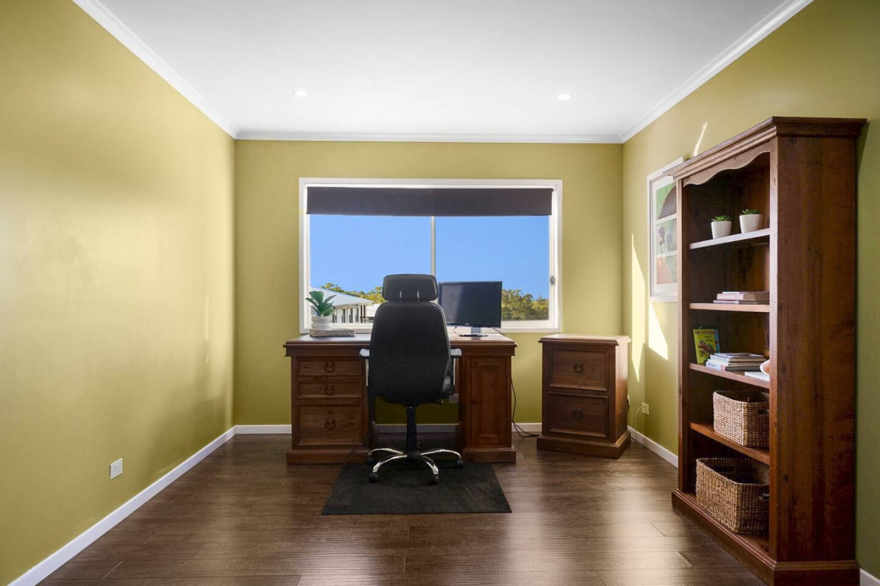 -Office/study offers a large timber desk and oversized computer chair with a double glass window that brings in the natural light and overlooks the yard.