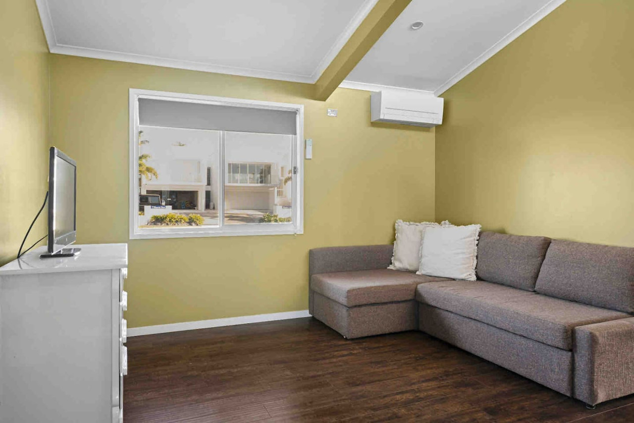 The lounge room features a large smart TV, CD player/radio and an air-conditioned unit.