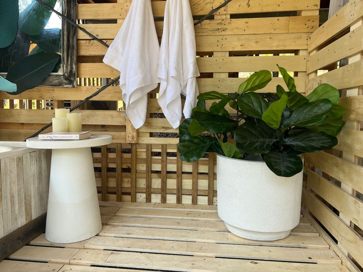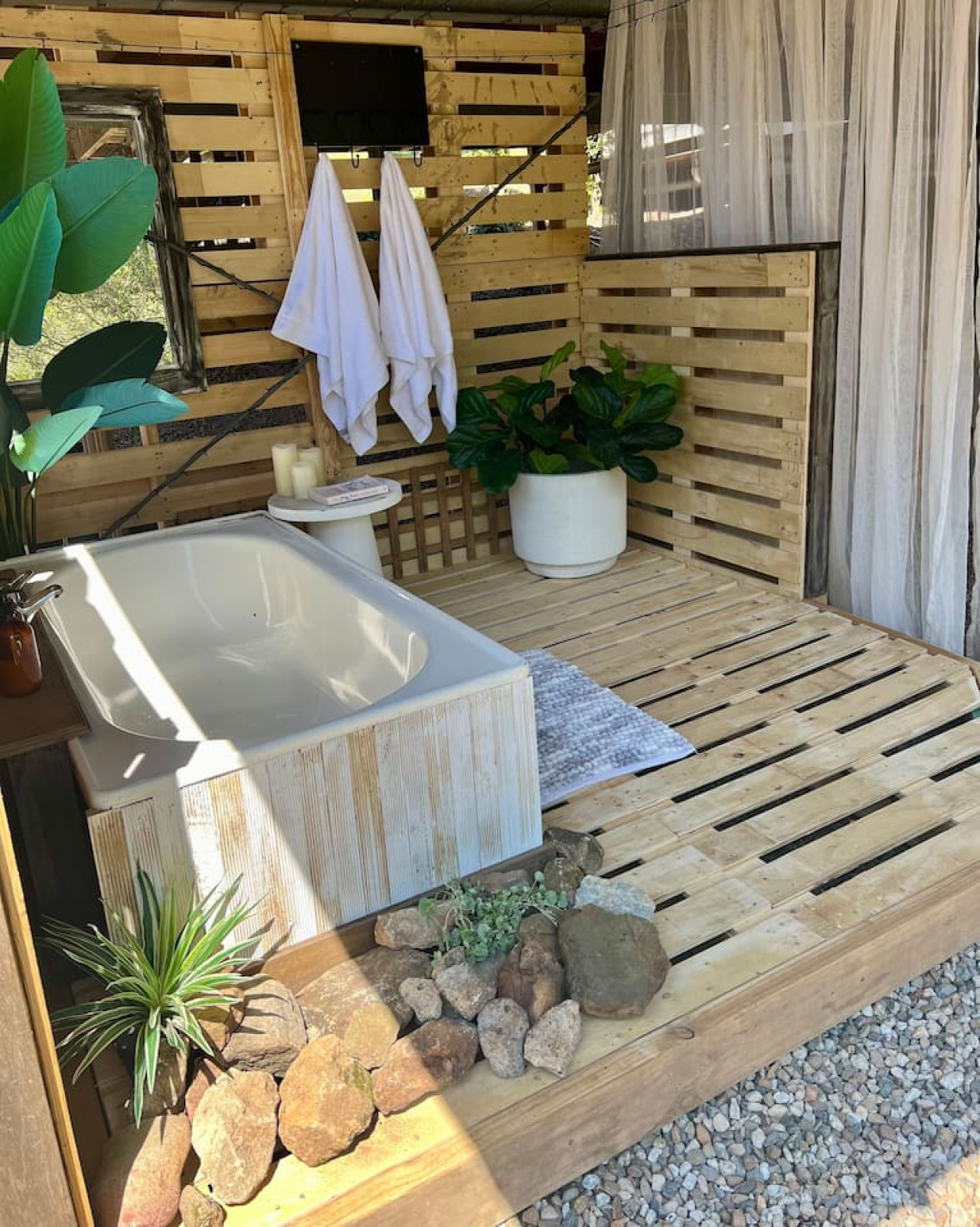 Relax and recharge with a unique outdoor bath area, ideal for soaking under the stars on warm summer nights or relaxing in the hammock; this getaway provides the perfect mix of peace and comfort.