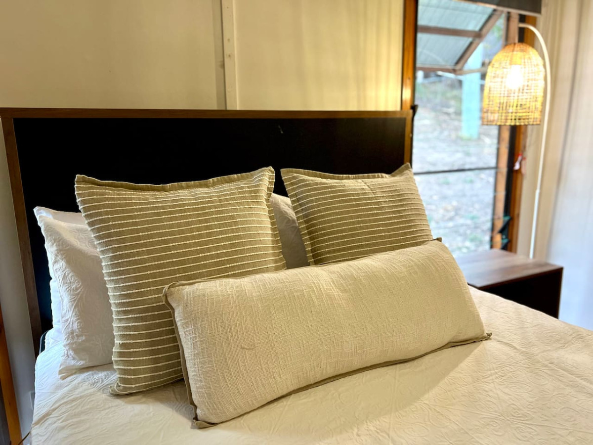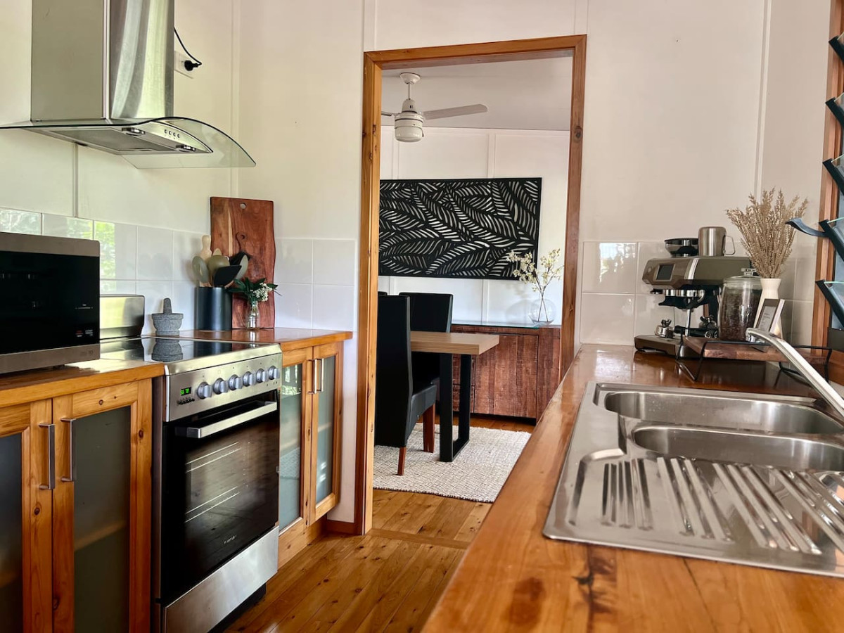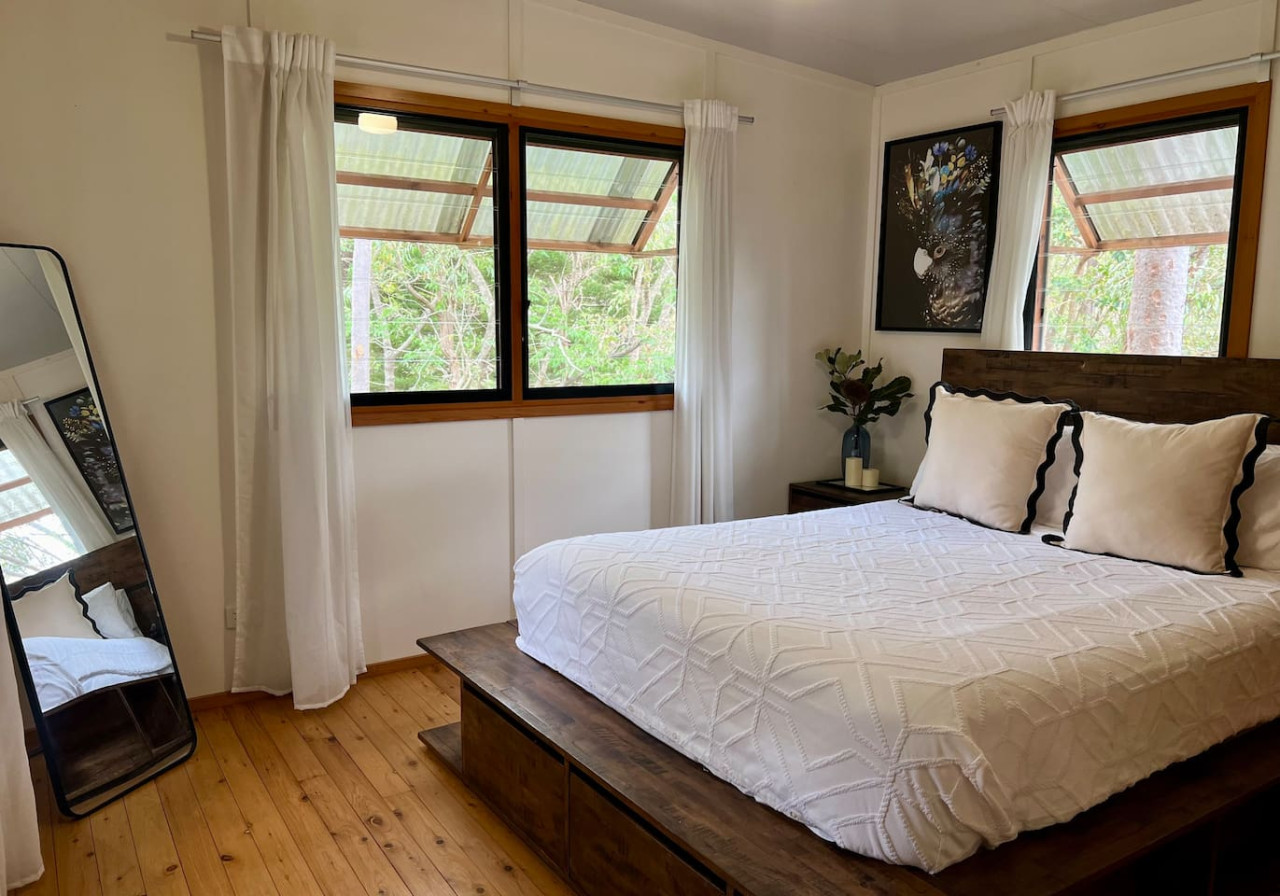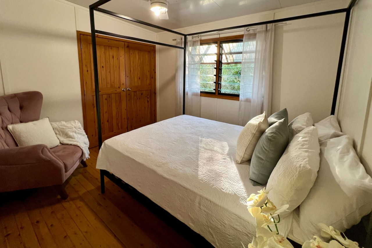 Escape to this charming 3-bedroom home, nestled in a peaceful bush setting, offering a perfect blend of comfort and nature. The spacious main bedroom features a luxurious queen bed, air conditioning, and a walk-in robe, with the added convenience of direct access to the two-way bathroom. Adjacent to the main bedroom, the second bedroom boasts a stunning four-poster bed and a ceiling fan for those warm nights. Tucked away at the back of the home, the third bedroom provides a cozy retreat with serene views of the surrounding landscape.